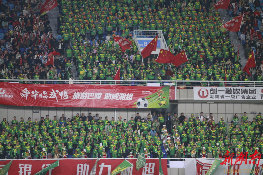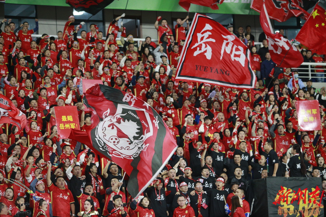 岳阳奥体中心上空细雨绵绵,气温仅12摄氏度,看台上,两抹鲜亮的色彩早已点燃了这座城市的热情:岳阳球迷身着烈焰般的红色球衣,如潮水般铺看台,郴州球迷则在客队区域筑起“南岭绿墙”,绿色围巾随着呐喊声上下翻涌。