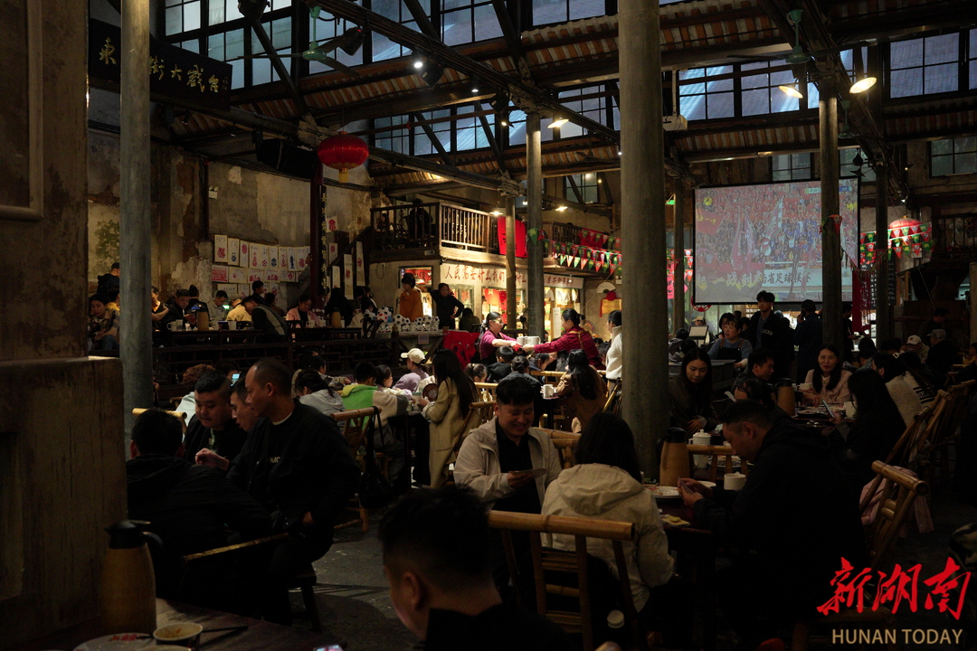 “长沙队居然连进五球,一球未失,喝着茶就能收获‘稳稳的幸福’,作为球迷太骄傲了!”长沙市民张先生没抢到门票,下午便来到东茅街茶馆的观赛“第二现场”,和好友点两份“湘超套餐”,喝茶、品美食,为“湘超”喝彩。