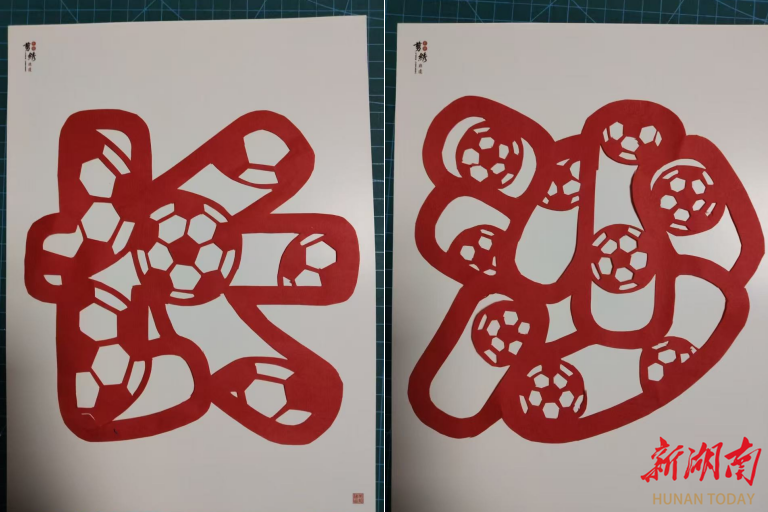 当晚,东茅街茶馆洋溢赛事和非遗剪绣交织的热闹氛围。半空中悬挂湘超旗帜,足球、茶馆logo剪绣相间,市民错落入座,谈笑风生。灯光变暗,巨大幕布“从天而降”,当长沙队的身影出现,茶馆顿时响起欢呼声。