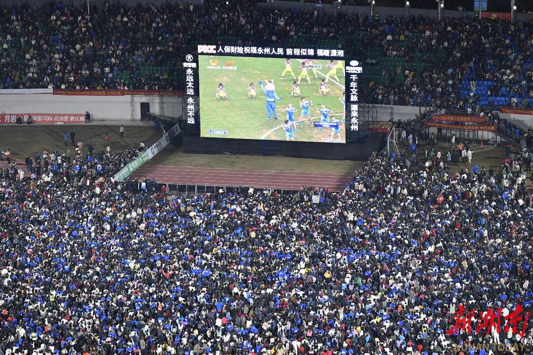 12月20日晚,永州市体育场,数万市民齐聚永州市体育场,为远征客场的家乡球队加油助威,“第二主场”汇成蓝色海洋。华声在线全媒体记者 童迪 摄