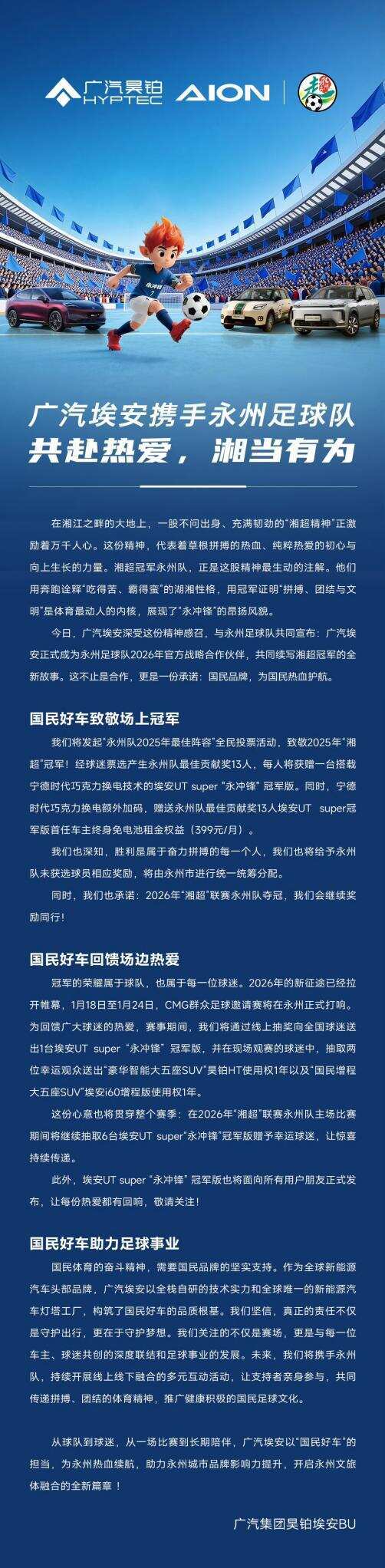 同时,在1月18日至24日于永州举办的CMG群众足球邀请赛期间,广汽埃安将通过线台埃安UT super“永冲锋”冠军版;并在现场观赛的球迷中,抽取两位幸运观众送出“豪华智能大五座SUV”昊铂HT使用权1年,以及“国民增程大五座SUV”埃安i60增程版使用权1年。更让人期待的是,在2026年“湘超”联赛永州队主场比赛期间,广汽埃安将继续抽取6台埃安UT super赠予幸运球迷。这一系列动作,形成了贯穿赛季的品牌互动体系。