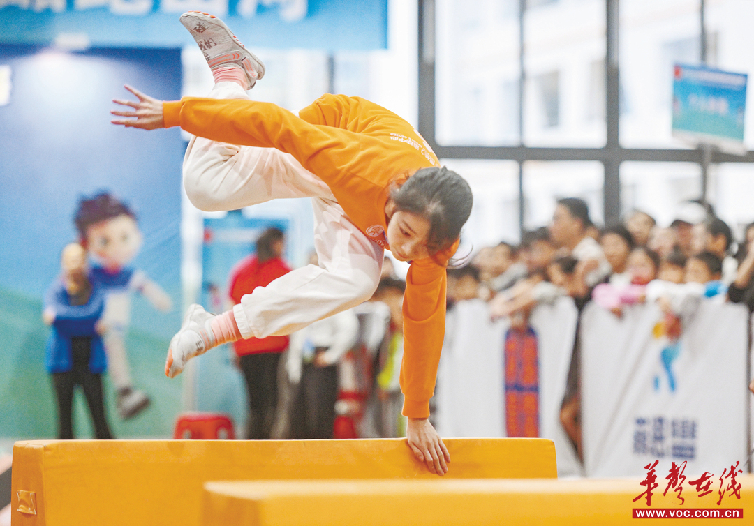 10月18日,小选手在比赛中翻越障碍。当天,2025年湖南省跑酷冠军赛在长沙市开福区新竹第二小学开赛。