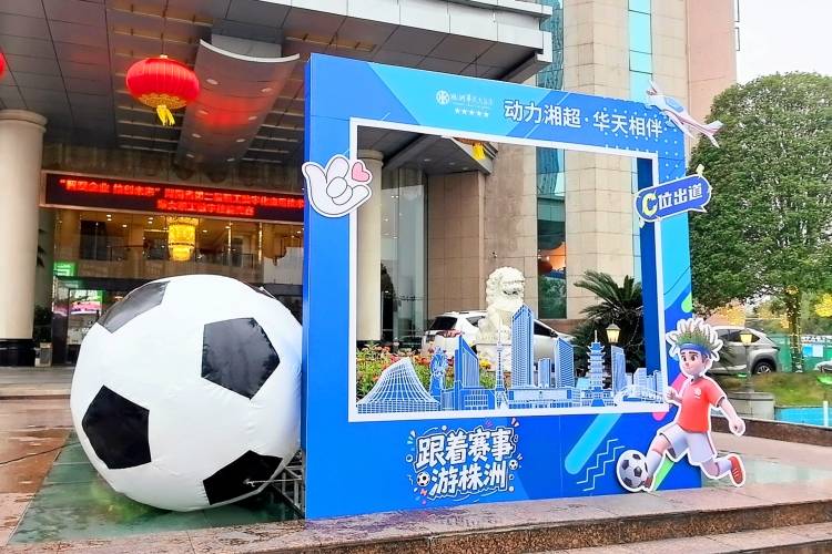 赛事期间,长沙通程国际大酒店、株洲华天大酒店、湘潭华都国际大酒店、湘潭华银国际大酒店、益阳碧桂园凤凰酒店等进行氛围焕新,在大堂、走廊、餐厅等公共区域增设“湘超”赛事主题装饰,包括巨幅赛事海报、球队应援灯箱、足球元素灯光秀、签名墙、湘超周边展示区等,营造出浓厚的赛事氛围。多家酒店还专门设置“湘超打卡互动区”,配备赛事主题相框、足球道具等,吸引球迷拍照分享,并可凭打卡记录兑换餐饮折扣等权益。