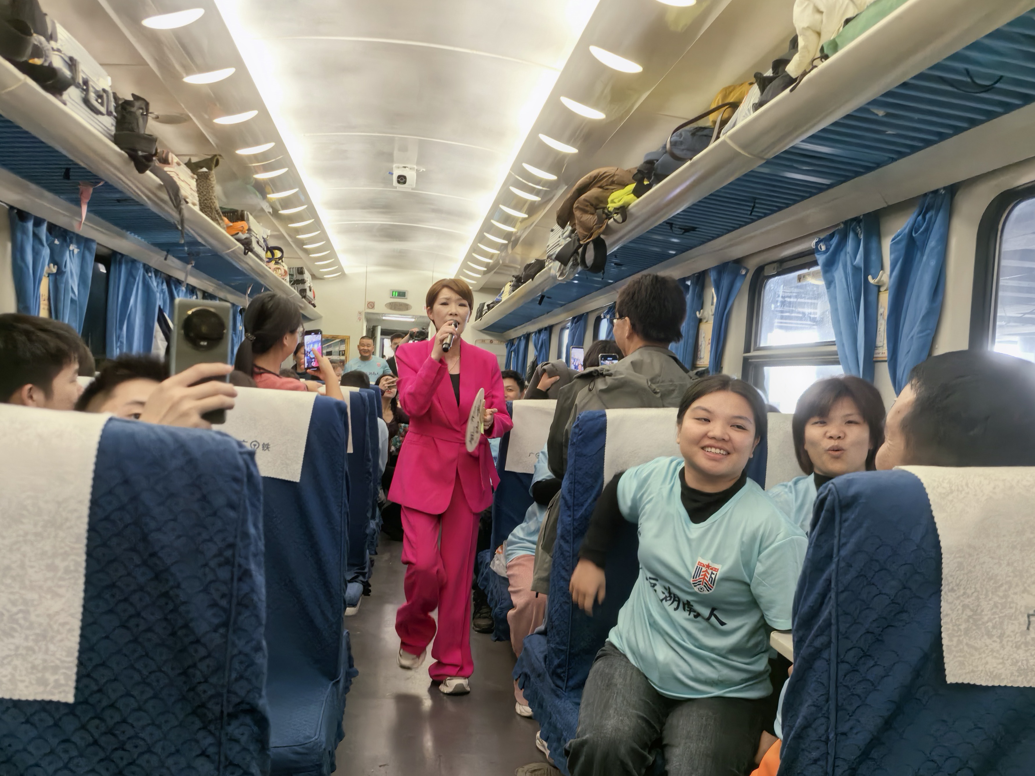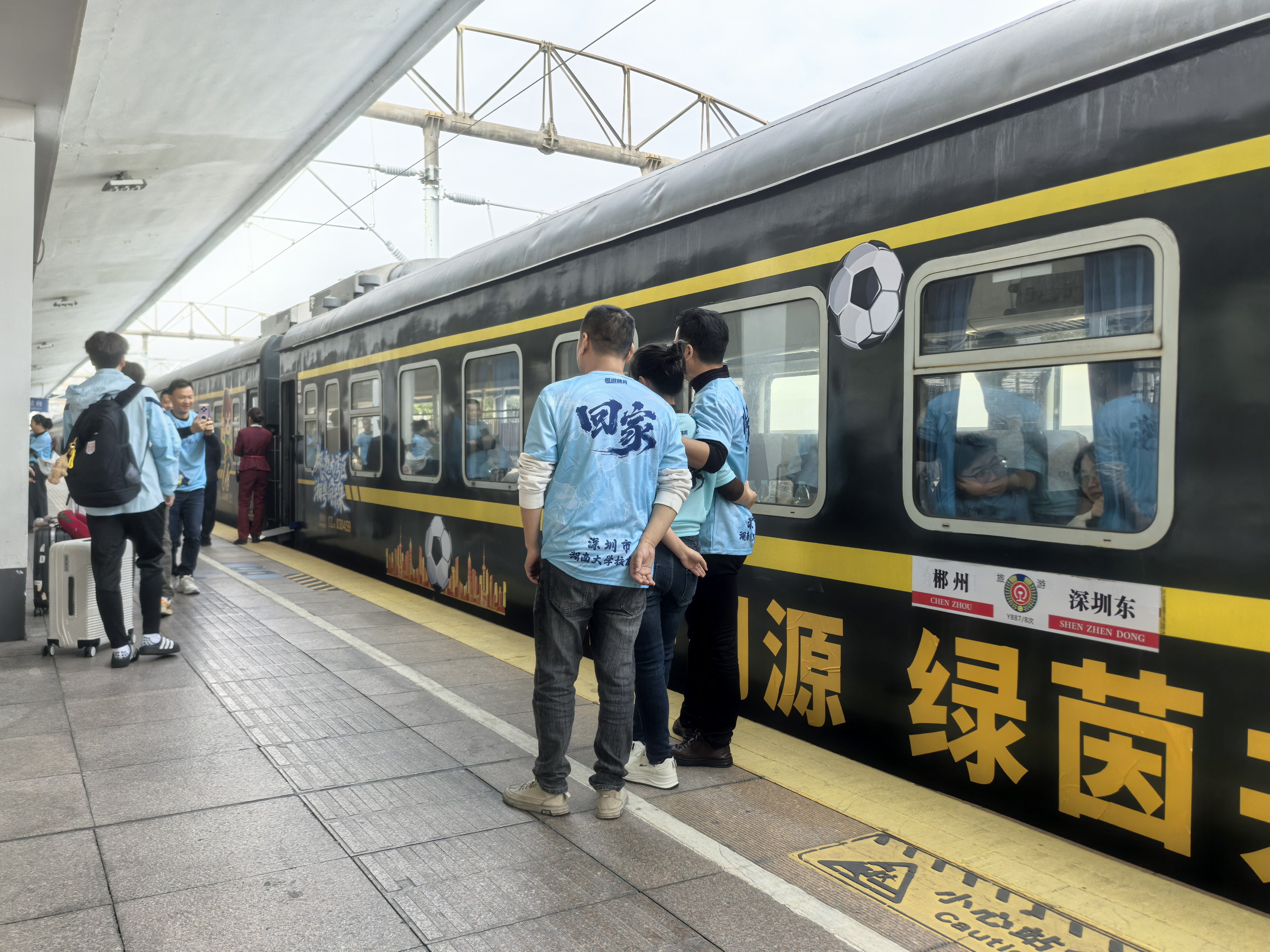 车厢里,郴州裕后街、北街、汽车总站等老照片营造出浓浓的怀旧氛围。工作人员和球迷们载歌载舞,现场化作一片欢乐的海洋。“南下工作快四十年了,这还是我第一次去郴州。”湖南老乡莫固华与老友约定郴州相见——自己北上,朋友则从长沙南下,“退休后我也踢足球,郴州队与大湾区湖南人队的这场比赛,我肯定要看。”
