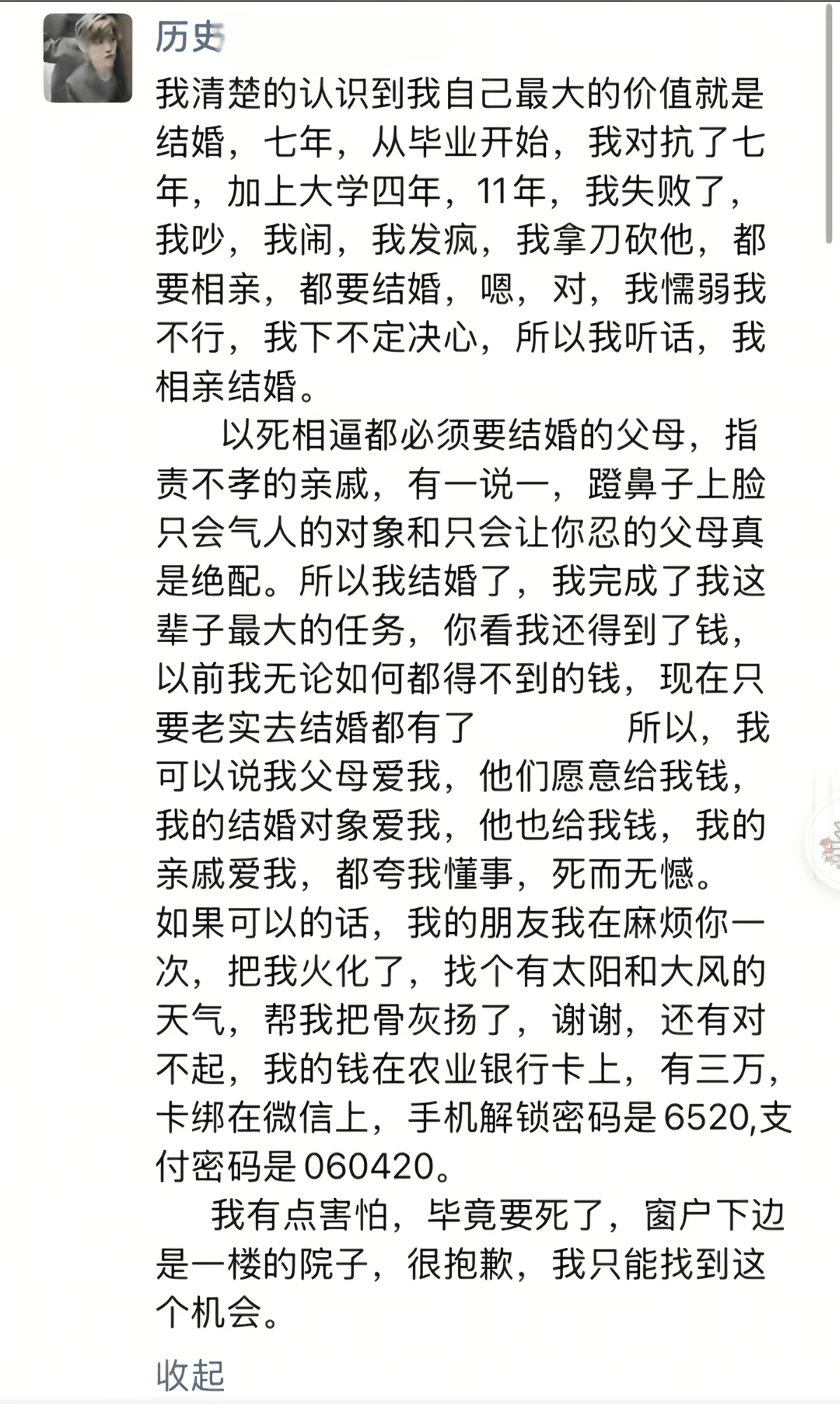 婚礼当天早上,魏亚蕊在朋友圈发布了那段令人心碎的“遗书”。她细心地交代了后事,甚至连自己的手机密码、银行卡密码都一一列出,卡上有三万元存款。