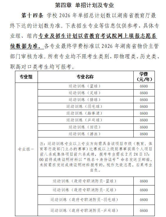 二、招生计划:2026年学院单招计划释放千余名额,涵盖体育类、普通类两大专业组。体育类核心专业包括运动训练、民族传统体育等,对接田径、篮球、足球等热门项目,配备省级以上优秀教练团队,与省体工队深度合作;普通类专业包含体育运营与管理、健身指导与管理、运动康复等,适配无专项基础但热爱体育的考生。其中,军士学院计划招收130人,对接武警部队,仅限湖南考生报考,入学可享受相关优待政策。