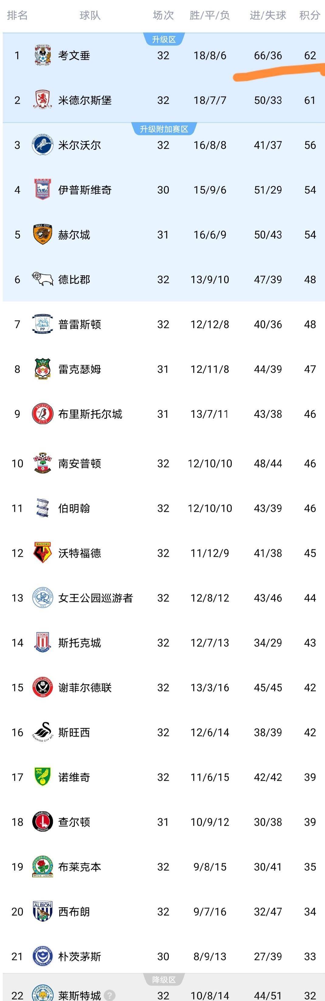 在积分榜上,赢球的考文垂积分达到62分,以1分的微弱优势超越米德尔斯堡,重新登顶。 这场直接对话的胜利,让他们在争夺直接升级英超名额的竞争中,占据了宝贵的心理优势和积分优势。